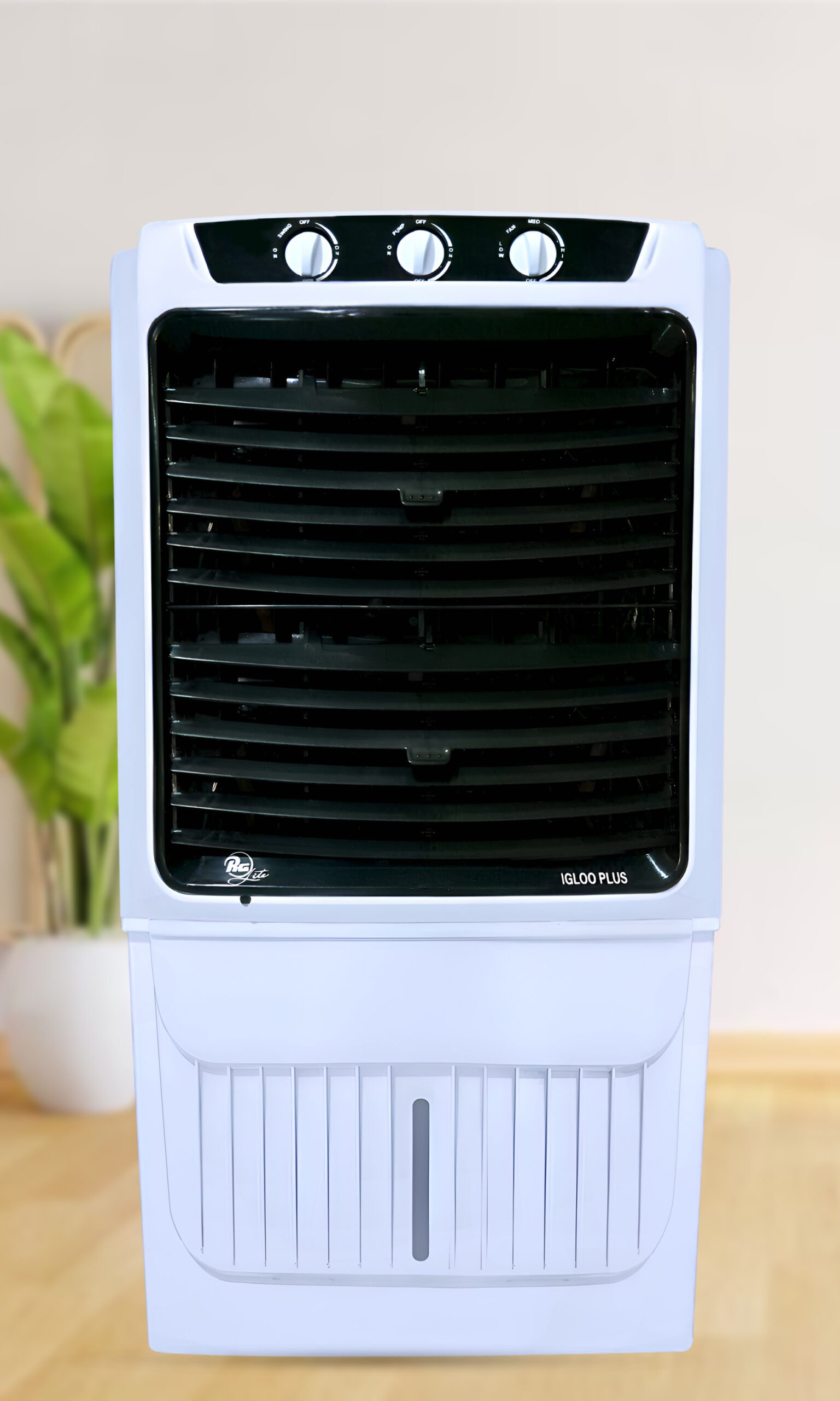 The RG Sub-Economy Cooler IGLOO PLUS is a 75-liter desert cooler with honeycomb pads for efficient cooling. It features a white design, a 3-speed fan, and consumes 180W of power. The cooler is equipped with castor wheels for easy mobility, a strong and robust body, automatic vertical swing, inverter compatibility, and comes with a 1-year warranty.
